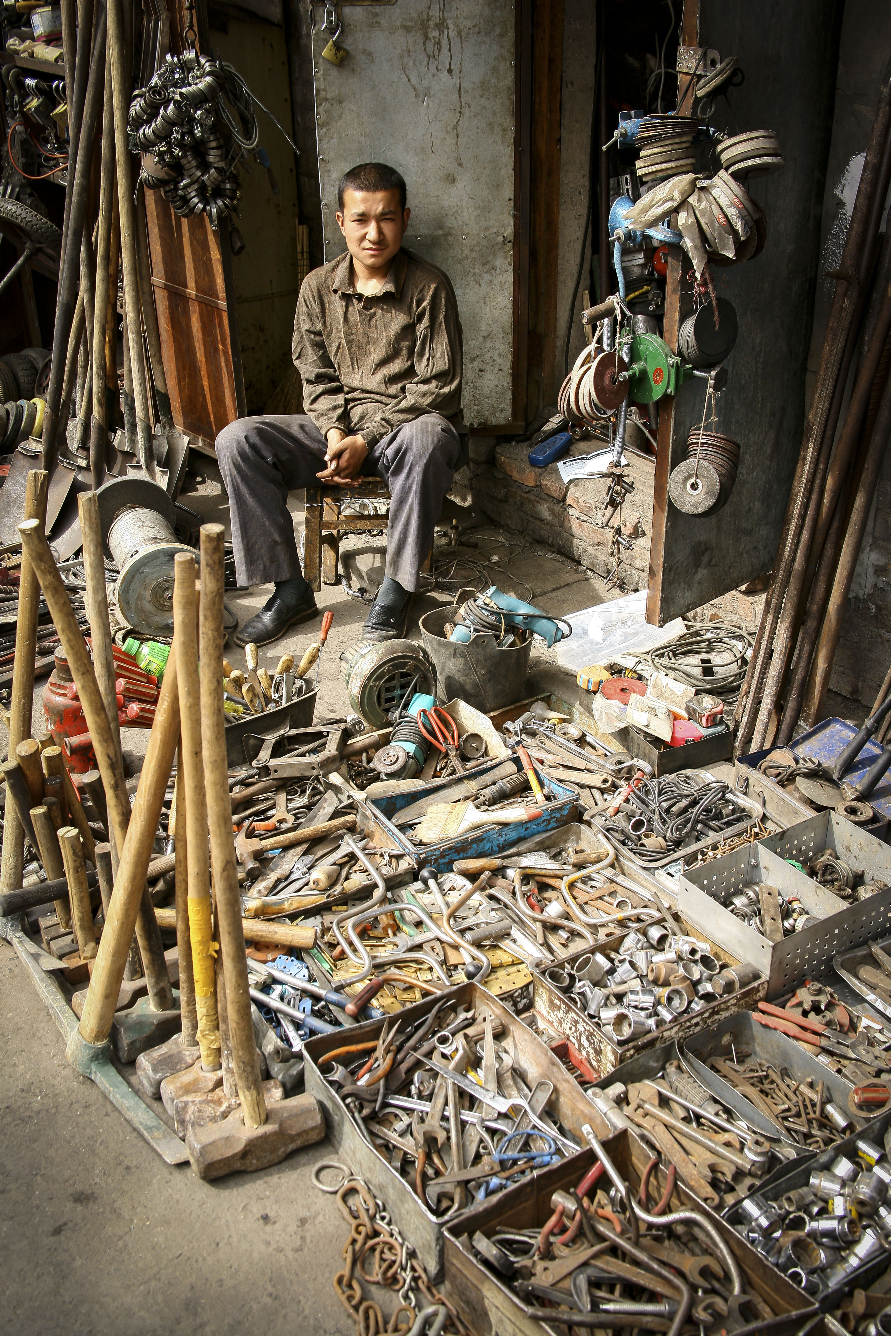 When we traveled through China we followed the ancient silk routes and started in the city of Urumqi. This city is a very old and dusty area populated by a mix of Chinese, Turks, Mongols and Russians. I took this shot in a Muslim bazaar located in the outskirts of town. I asked to take the shot, he smiled and then when I raised up my camera, he quickly frowned. After I took the shot and thanked him he gave me a quick smile and went about his business. I guess he knew I wasn’t in the market for a sledgehammer or a wrench at the moment.
